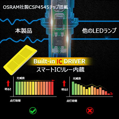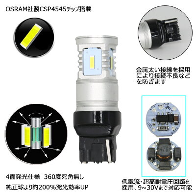 商品特徴 ●高輝度CSP4545チップを4基搭載 最新型CSP LEDを搭載したバルブ全光束2400ルーメンの大光量を誇るバックランプ・ポジション専用球です。