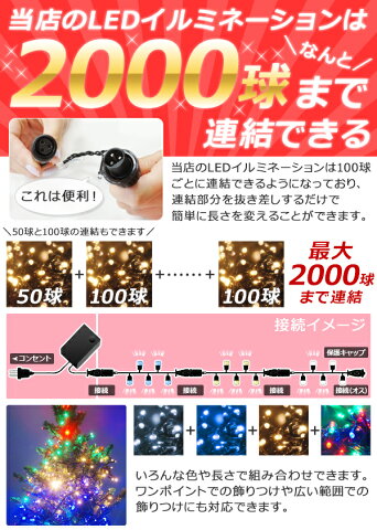 また、屋外でも使用できる防滴仕様なので、デコレーションの幅が広がること間違いなし! 当店で取り扱いのイルミネーションは接続部分が同じなので、最大2000球まで連結できます。